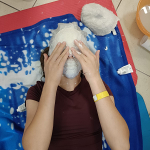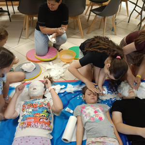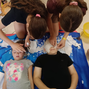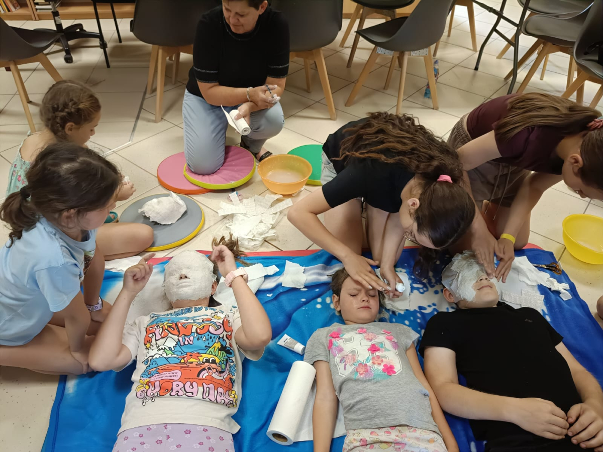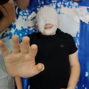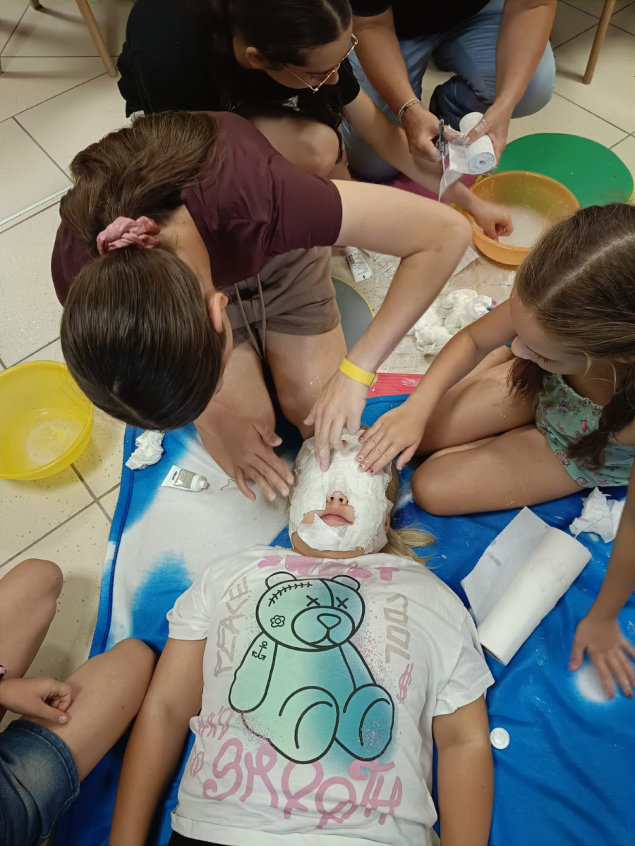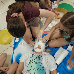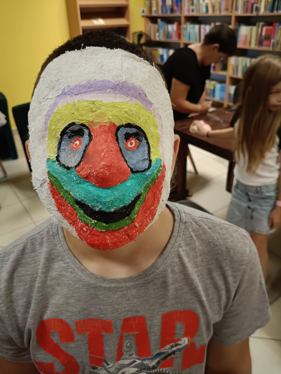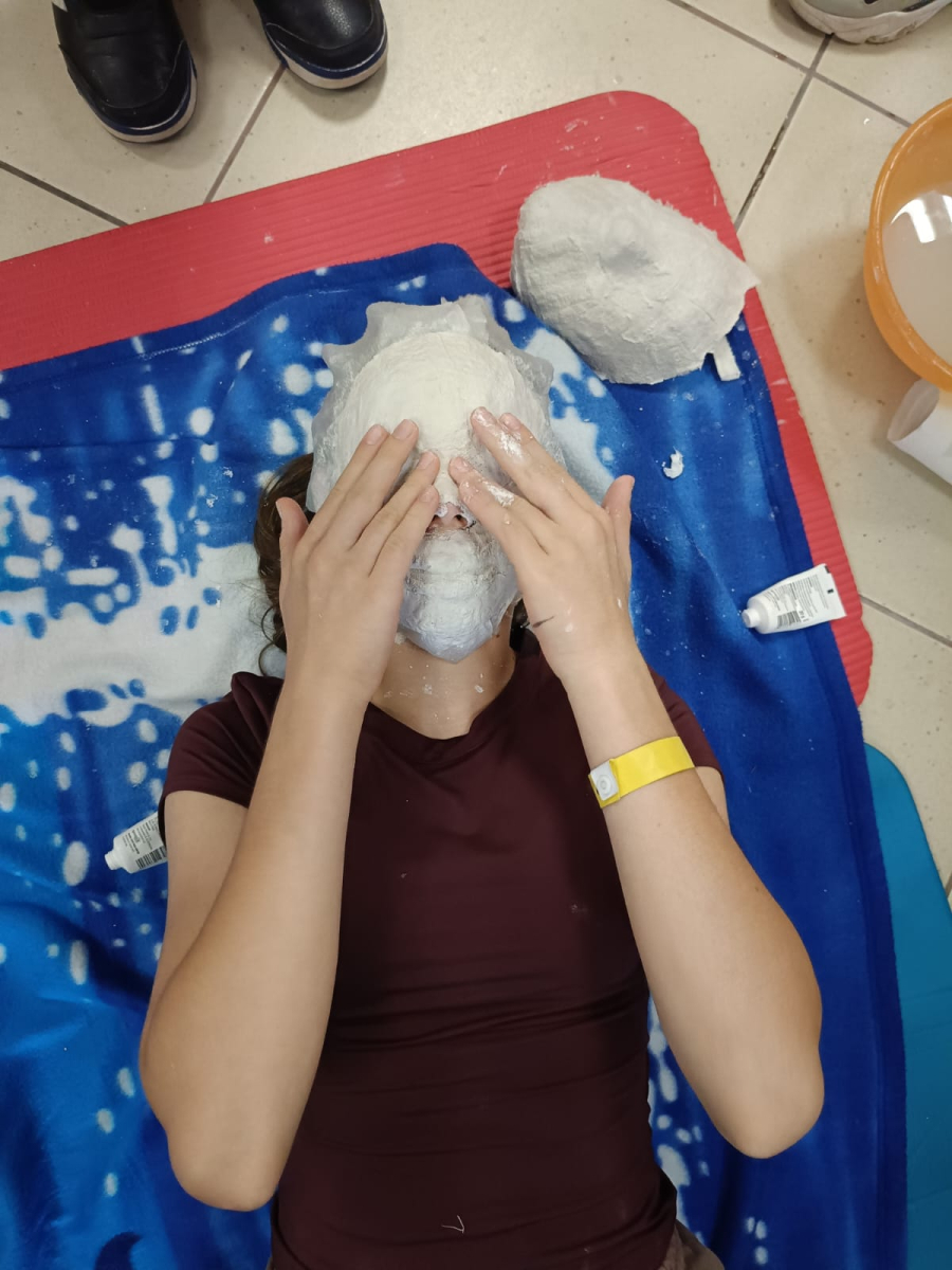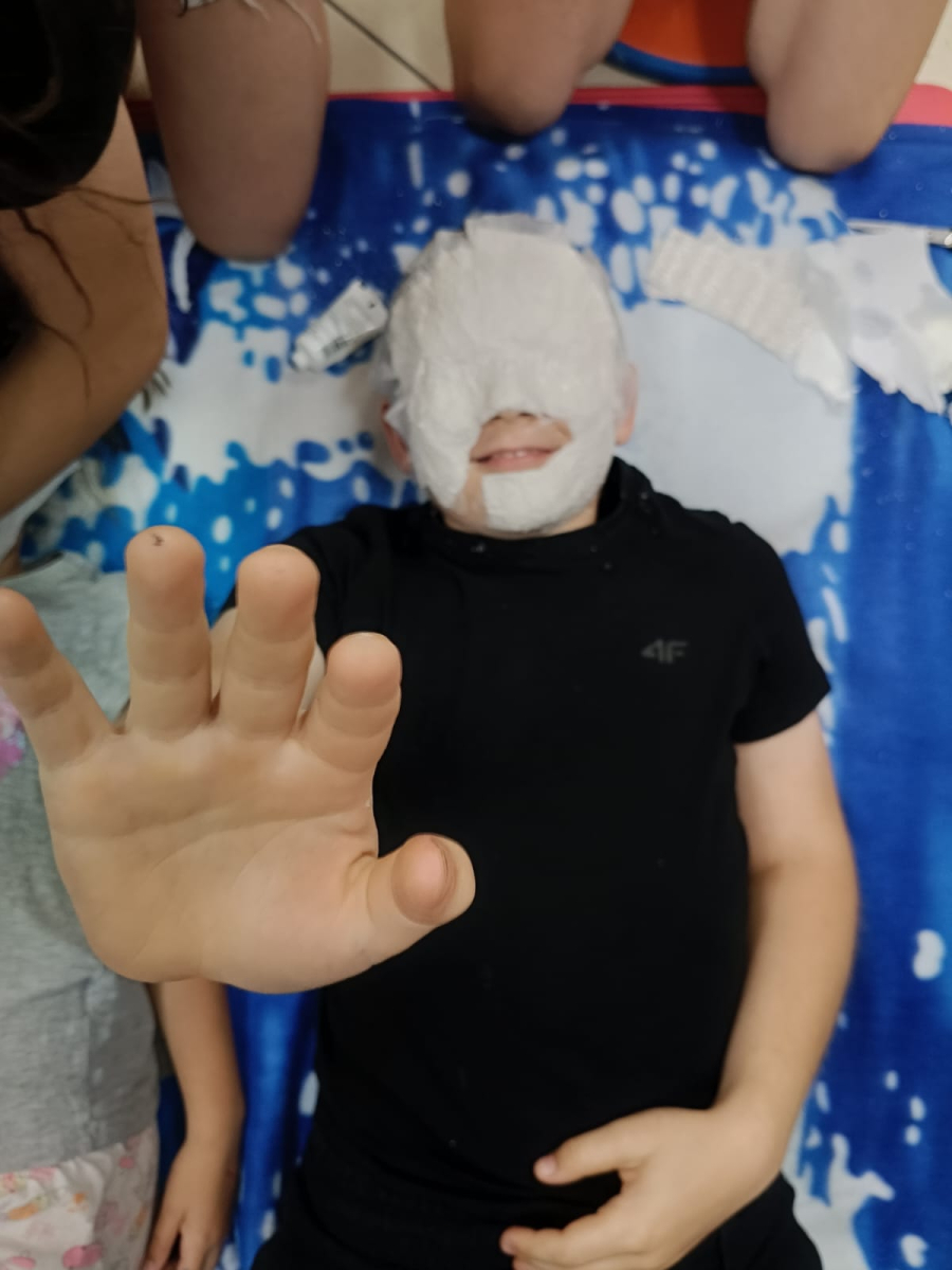 Po krótkiej przerwie śniadaniowej dzieci wzięły udział w warsztatach tworzenia gipsowych masek. To było zadanie dla odważnych - wytrzymać w bezruchu i ciszy smarowanie twarzy wazeliną, nałożenie papierowej ochrony oraz kilku warstw bandaża gipsowego. Potem jeszcze czekanie aż maska wyschnie i już można było zdjąć ją z twarzy.