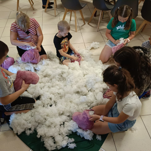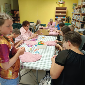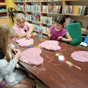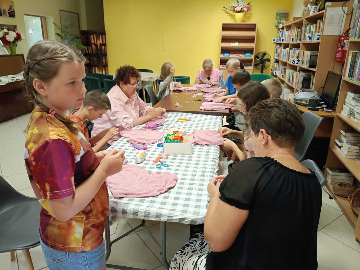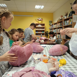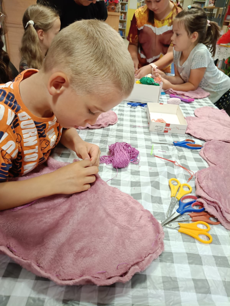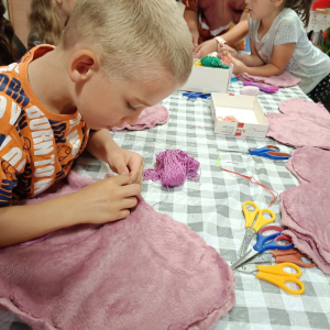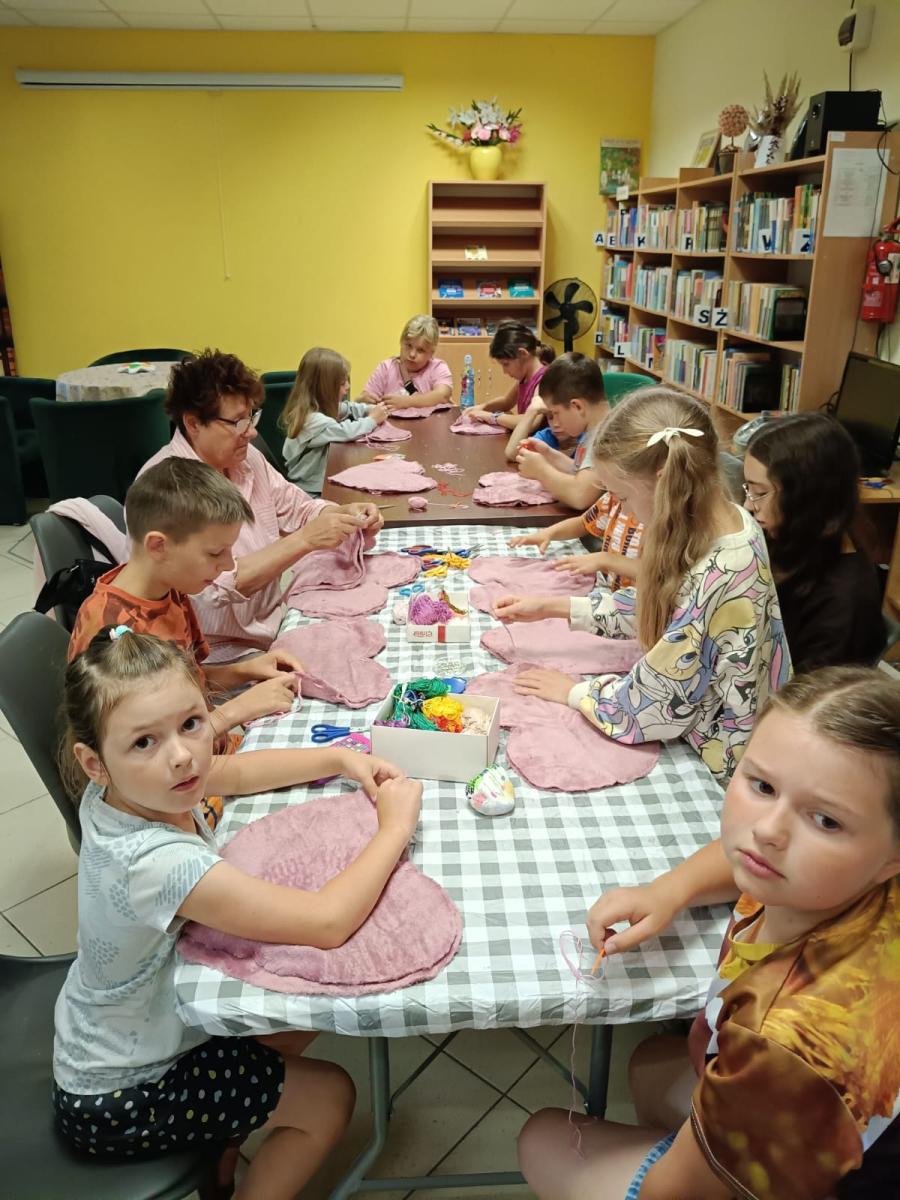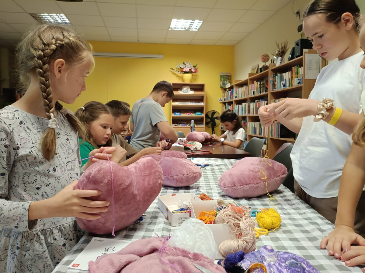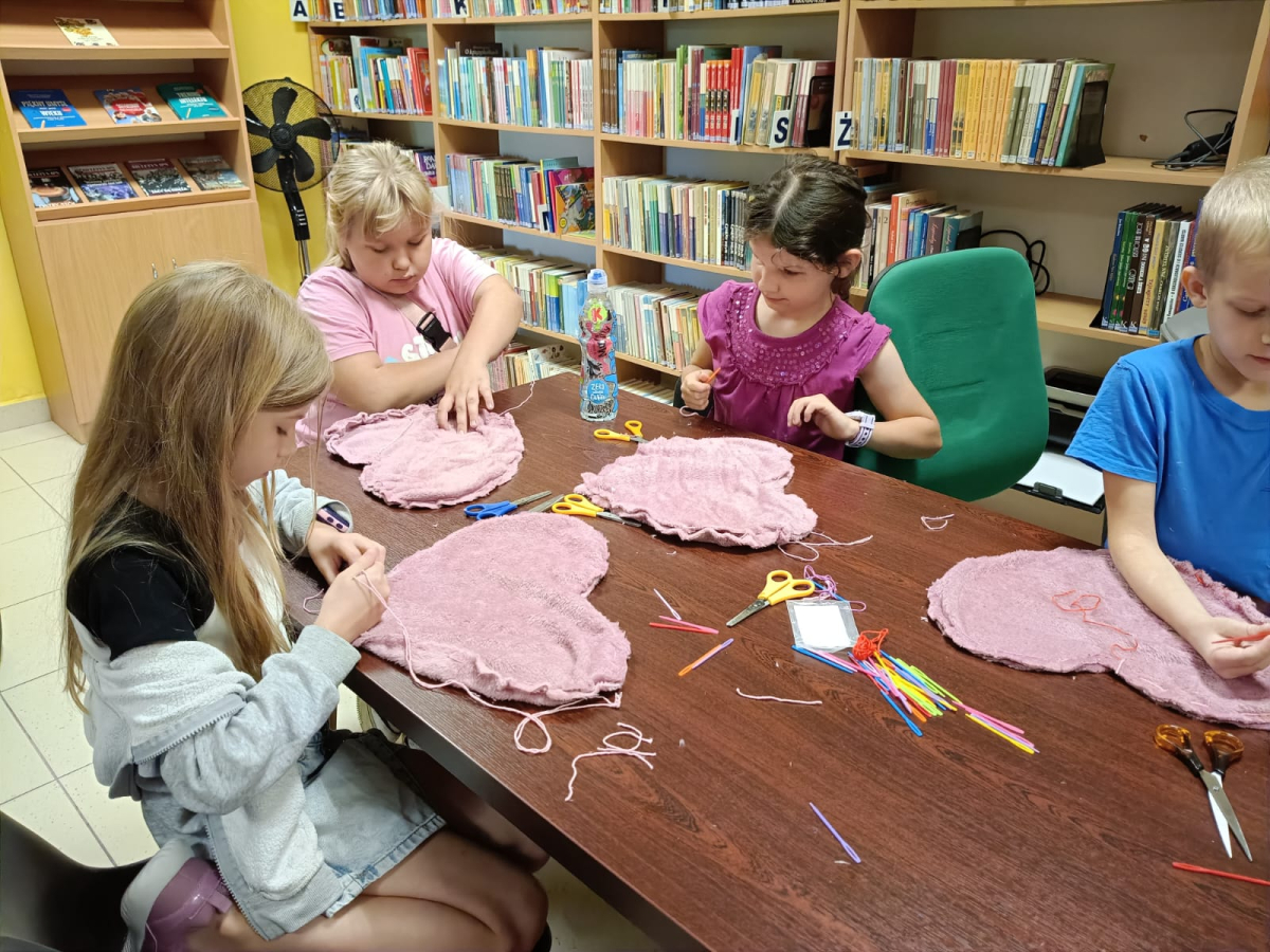 W czwartek na zajęciach wakacyjnych było bardzo kreatywnie. Na początku wzięliśmy się za szycie poduszek w kształcie serca. Fastrygowania oraz prostego ściegu stębnowego uczyła dzieci pani Elżbieta Radlińska-Trębicka z Koło Gospodyń Wiejskich w Mordach. Cierpliwie i z uśmiechem tłumaczyła kolejne kroki szycia i w ruch poszły kolorowe, plastikowe igły oraz kordonek. Dzieci pracowały w skupieniu i wygląda na to, że polubiły nową umiejętność. Jutro dokończymy poduchy, a dzieci będą odtąd cerować dziury w ubraniach.