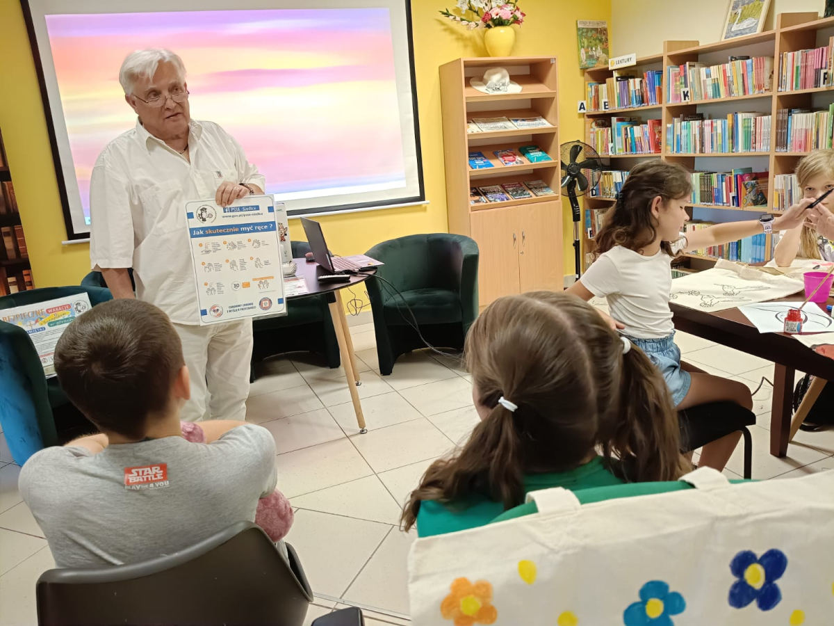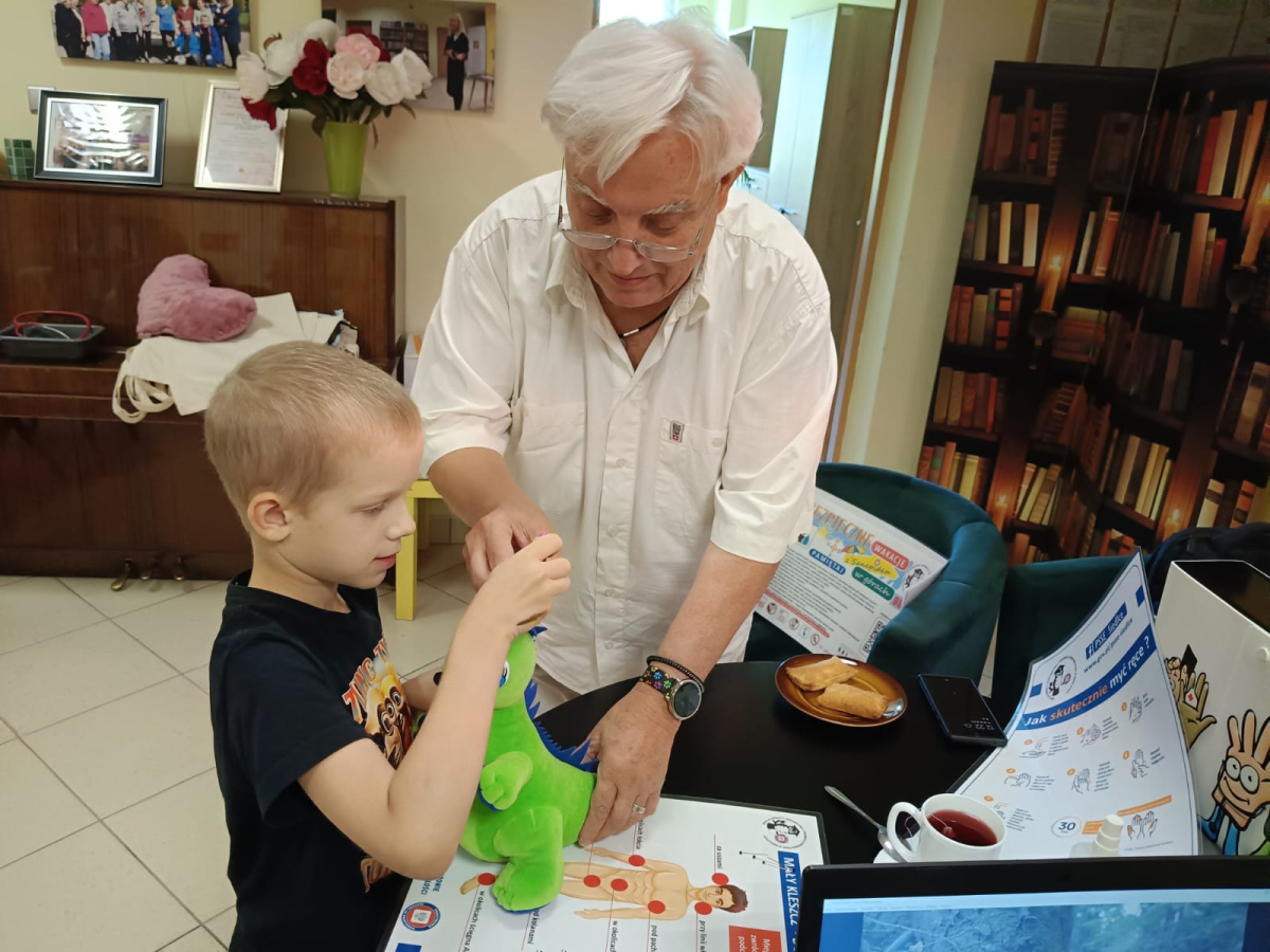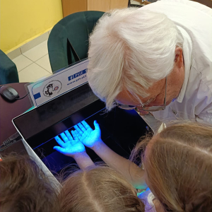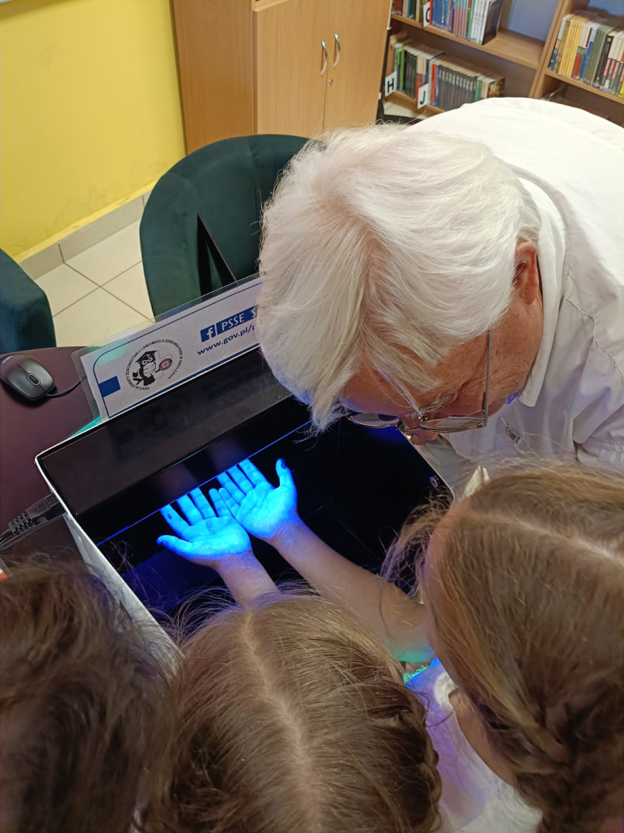 Bardzo ciekawe warsztaty poprowadził pan Jacek Rutkowski z sekcji Oświaty Zdrowotnej i Promocji Zdrowia Psse Siedlce. Dzieci wysłuchały wiele ciekawych porad odnośnie bezpieczeństwa i chętnie dzieliły się swoimi doświadczeniami i wiedzą. Poznały też zagrożenia, jakie niosą kleszcze i z chęcią uczyły się ich bezpiecznego usuwania. Wiedzą także, że po pomoc w usunięciu kleszcza można udać się do przychodni lekarskiej. Dużym zainteresowaniem cieszyło się doświadczenie o myciu rąk. Pan Jacek spryskiwał dłonie dzieci specjalnym płynem, którym trzeba było umyć ręce. Następnie w ultrafiolecie sprawdzana była dokładność ich mycia. Okazuje się, że to nie taka prosta sprawa. Dzieci szorowały rączki, a urządzenie pokazywało miejsca, które trzeba było jeszcze domyć.