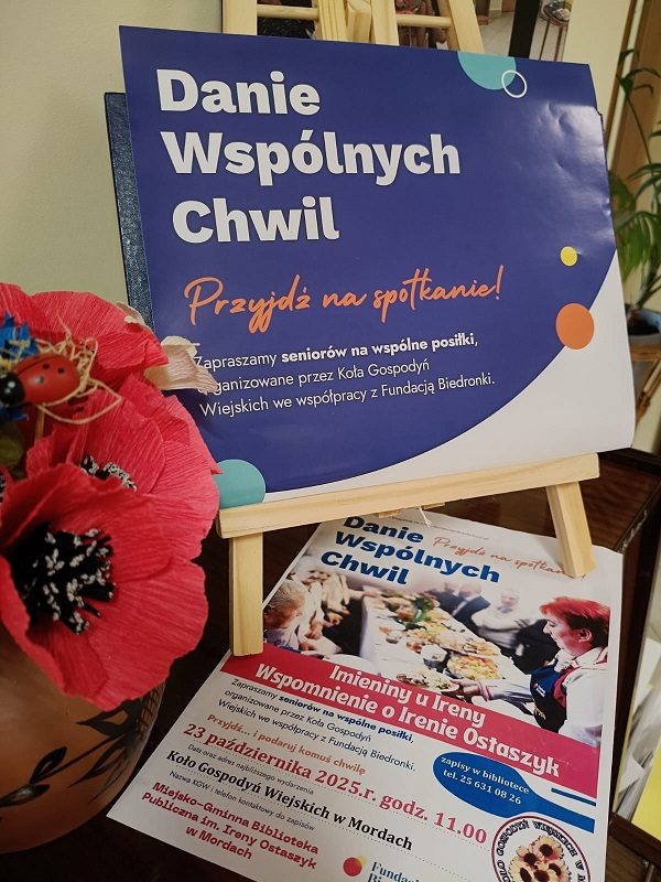 23 października 2025 roku w Miejsko-Gminnej Bibliotece Publicznej im. Ireny Ostaszyk w Mordach odbyło się zorganizowane przez Koło Gospodyń Wiejskich w Mordach wyjątkowe spotkanie seniorów w ramach programu „Danie Wspólnych Chwil” z Fundacją Biedronki. To szczególny dzień – pełen wspomnień, wzruszeń i ciepła – poświęcony pamięci patronki naszej biblioteki, charyzmatycznej kobiety, poetki, społeczniczki i animatorki życia kulturalnego, Ireny Ostaszyk.