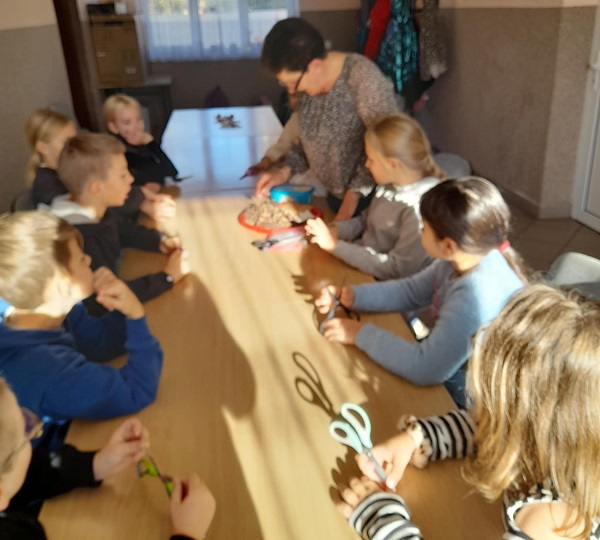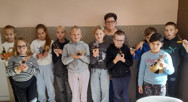 20 października uczniowie klasy III wybrali się do Filii Bibliotecznej w Radzikowie Wielkim, aby wziąć udział w wyjątkowych, jesiennych warsztatach. Pani bibliotekarka Jadwiga Kulikowska zabrała dzieci w świat książki „Złodziej liści”, opowiadając o barwnych zmianach zachodzących w przyrodzie. Uczniowie dowiedzieli się, dlaczego liście zmieniają kolor i spadają z drzew, a następnie z papieru, szyszek i żołędzi stworzyli uroczą wiewiórkę – główną bohaterkę opowieści.