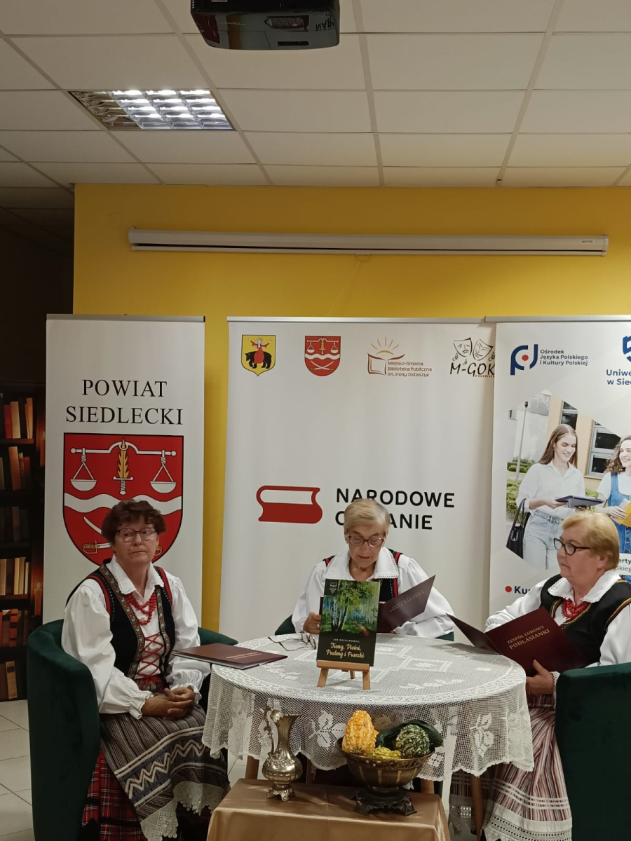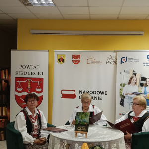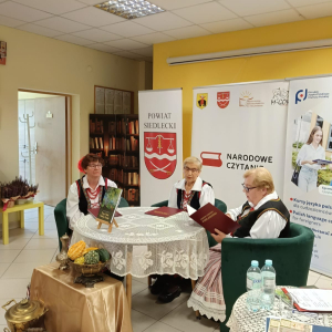 Na uczestników Narodowego Czytania czekały upominki w postaci pamiątkowych egzemplarzy poezji Jana Kochanowskiego i torby na książki "Zaczytany Powiat Siedlecki" zakupione ze środków budżetu Powiatu Siedleckiego przeznaczonych na realizację zadań biblioteki powiatowej oraz bukieciki kwiatów z bibuły autorstwa Elżbiety Radlińskiej-Trębickiej z Koła Gospodyń Wiejskich w Mordach.