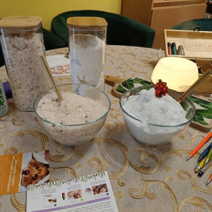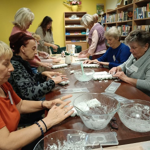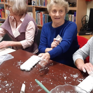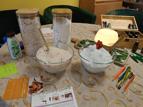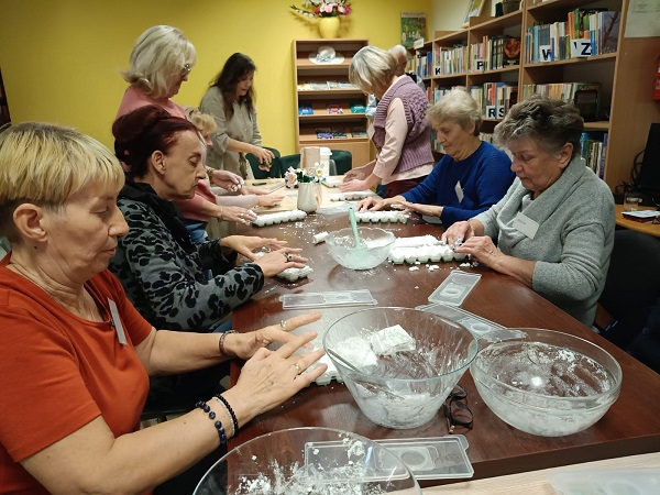 W części praktycznej seniorzy z zaangażowaniem tworzyli naturalne sole do kąpieli z dodatkiem olejków eterycznych oraz ekologiczne kostki do zmywarki, wykorzystując łatwo dostępne, proste składniki. Dzięki temu uczestnicy przekonali się, że tworzenie domowych, przyjaznych środowisku produktów nie tylko ogranicza ilość odpadów, ale także pozwala zaoszczędzić i zadbać o zdrowie. W czasie pracy w całej bibliotece unosił się przyjemny zapach dzikiej pomarańczy, który wprowadzał atmosferę relaksu i pozytywnej energii.