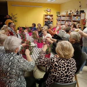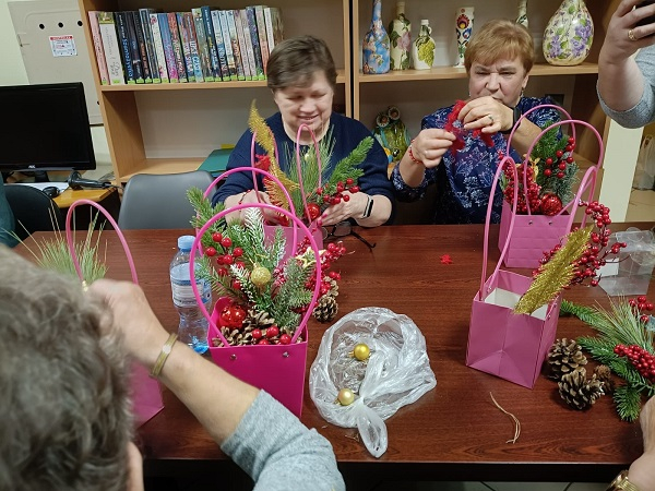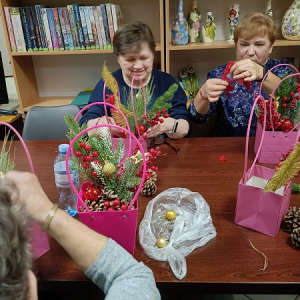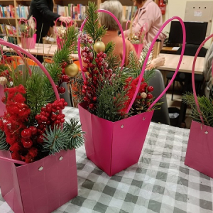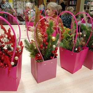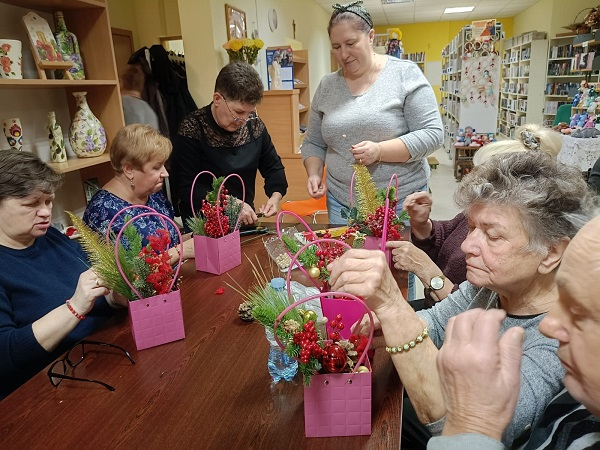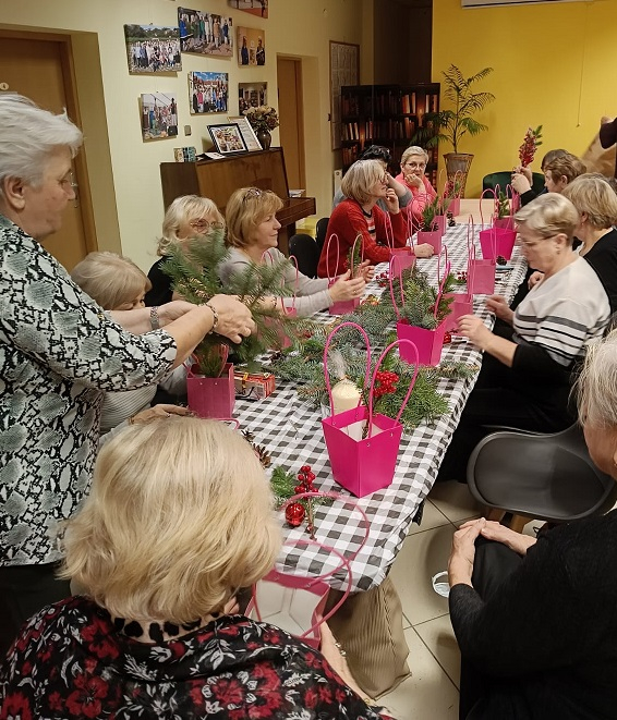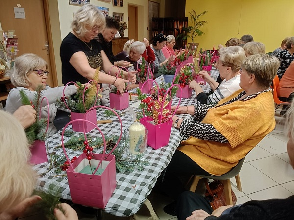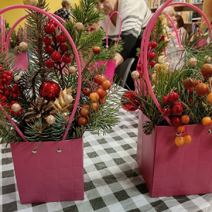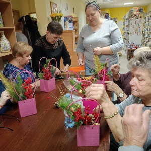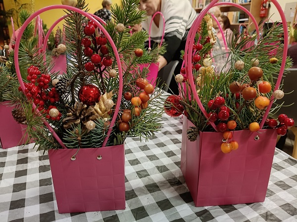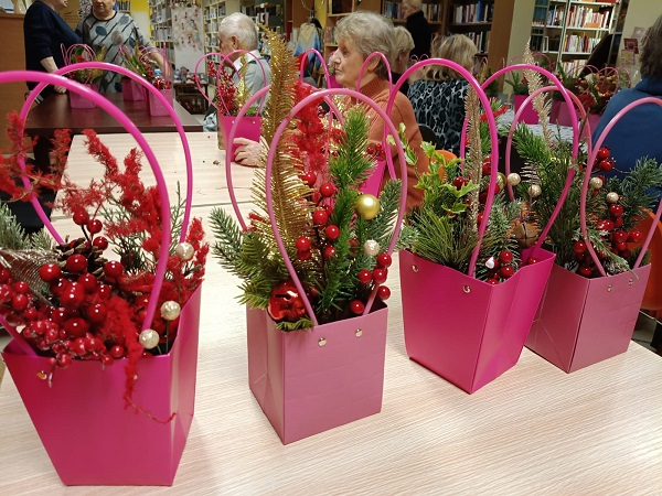 3 grudnia Anna Szpura poprowadziła warsztaty świąteczne dla seniorów. W ozdobnych torebkach prezentowych powstały świąteczne stroiki w barwach różu, zieleni, złota i czerwieni.