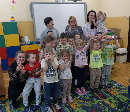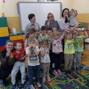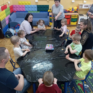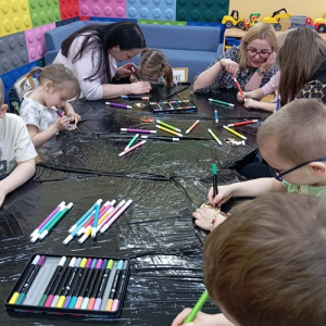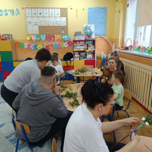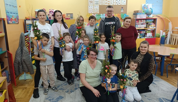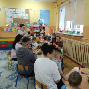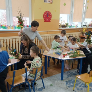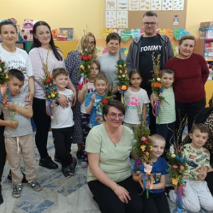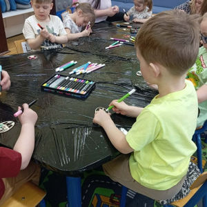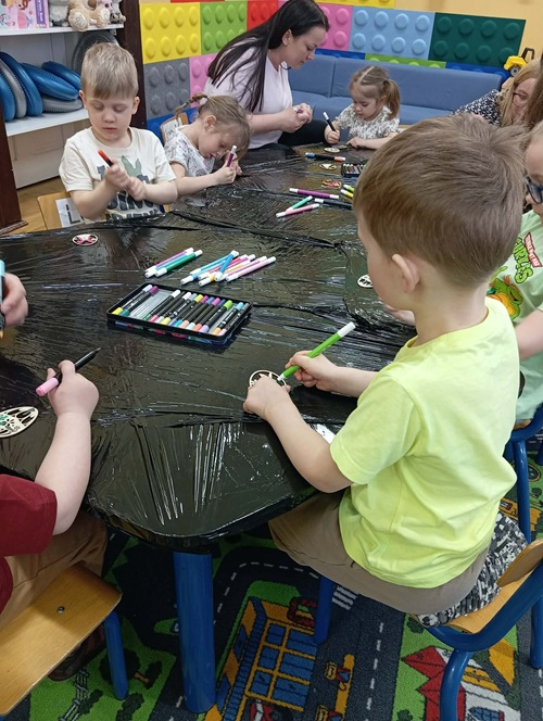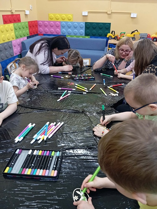 W młodszej grupie dzieci ozdabiały pisanki ze sklejki, w której zostały wycięte piękne wielkanocne wzory. Pomalowane akrylowymi mazakami stworzyły zawieszki do ozdobienia wiosennych gałązek w stroikach.