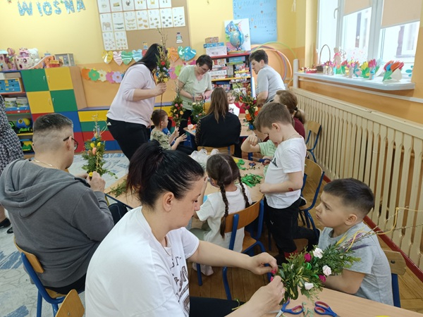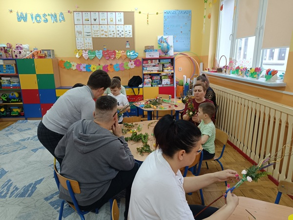 Pani Jadzia Kulikowska z Filii Bibliotecznej w Radzikowie Wielkim, inspirując się nauką u mistrzyni tej sztuki – Krystyny Haliny Noszczak z Koła Gospodyń Wiejskich w Mordach – przygotowała piękne kwiaty z bibuły. To właśnie one zostały wplecione w palmy tworzone podczas warsztatów.