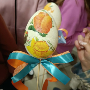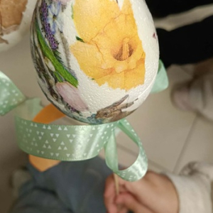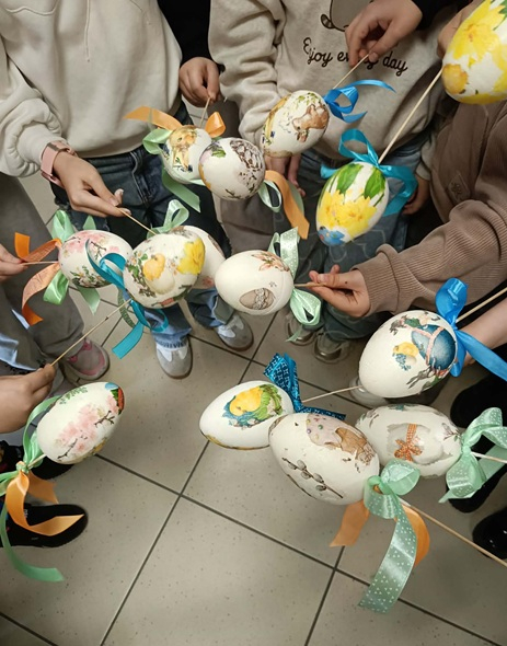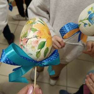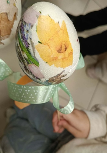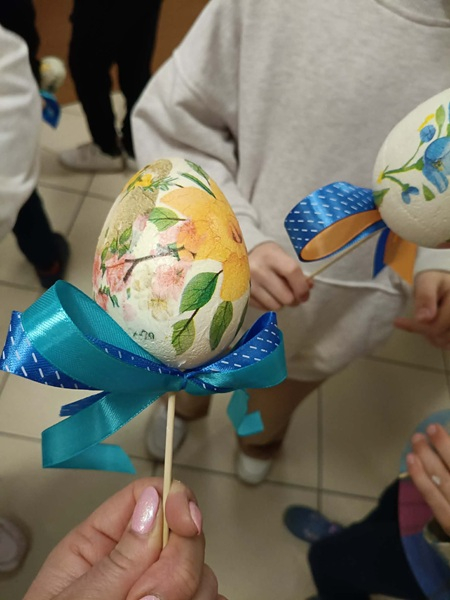 Dzięki swojej kreatywności oraz staranności dzieci tworzyły wyjątkowe dekoracje, wykorzystując kolorowe serwetki z motywami wielkanocnymi – pojawiły się na nich wiosenne kwiaty, urocze kurczaczki i zajączki. Każde jajko było inne i niepowtarzalne, co sprawiło, że powstała prawdziwa galeria pięknych, ręcznie wykonanych ozdób.