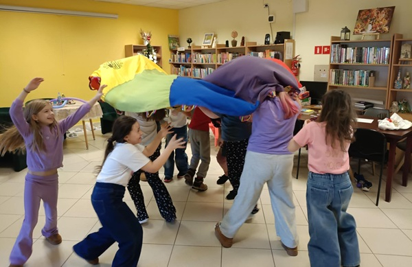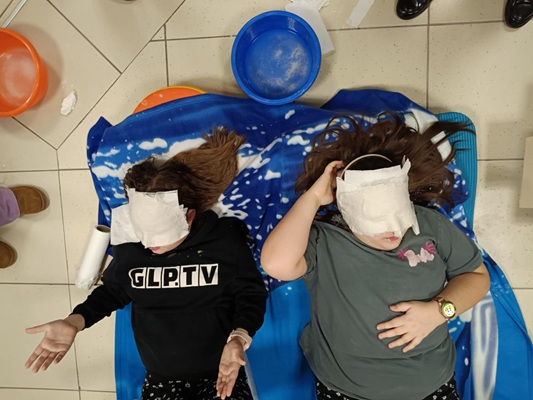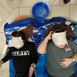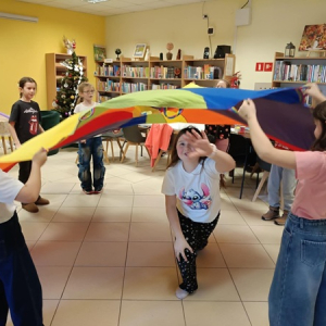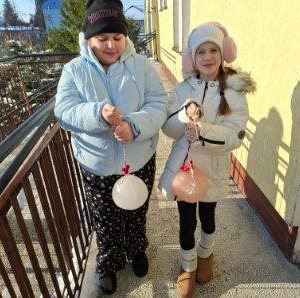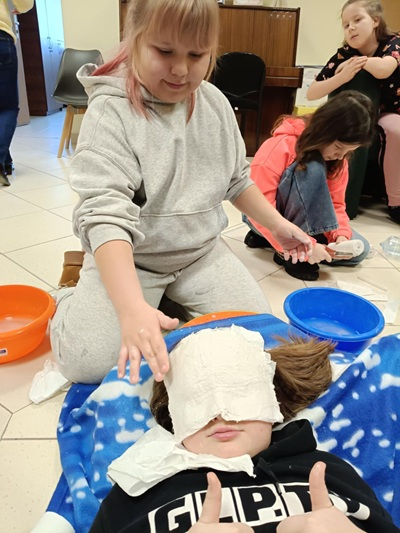 Podczas zajęć feryjnych dzieci miały okazję wykonać karnawałowe maski z gipsu, które po wyschnięciu ozdabiały akrylowymi flamastrami. Nie zabrakło także zagadek, gier i zabaw integracyjnych, a wspólna zabawa z chustą Klanzy dostarczyła mnóstwo śmiechu i energii. W międzyczasie mali odkrywcy stworzyli niezwykłe kule lodowe, łącząc zabawę z elementami eksperymentowania. Dzieci ozdabiały także deseczki metodą serwetkową, dzięki czemu powstały piękne obrazki, które mogły podarować swoim babciom i dziadkom z okazji ich święta.